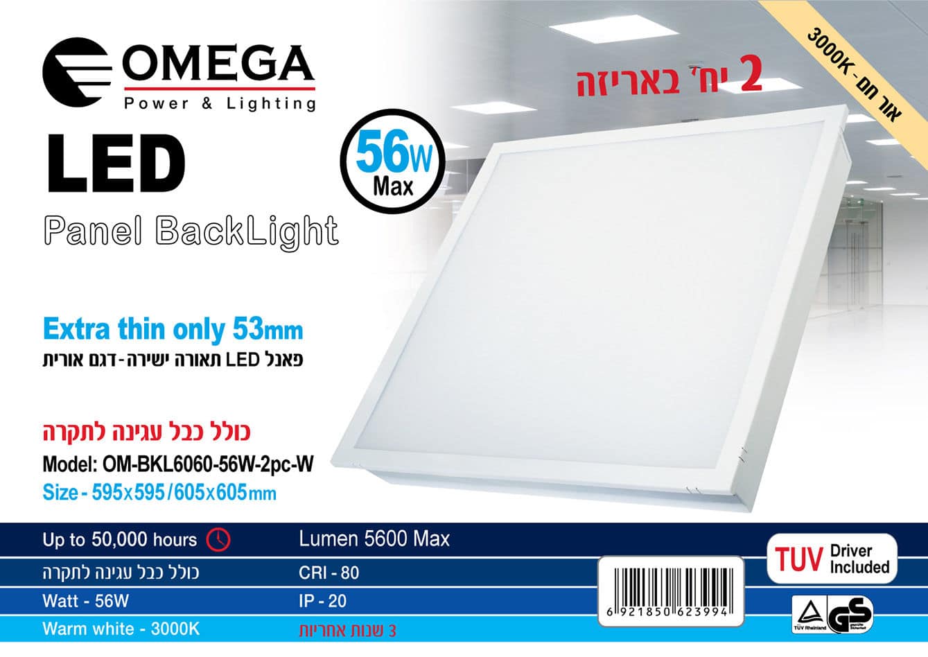 פנל לד דגם אורית 56W תאורה ישירה לתקרה אקוסטית