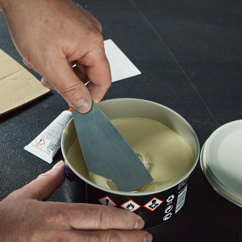 חומר פחחות פוליאסטר דו רכיבי מתקדם המיועד לתיקון מקצועי של חורים ואי סדירויות במגוון משטחים.