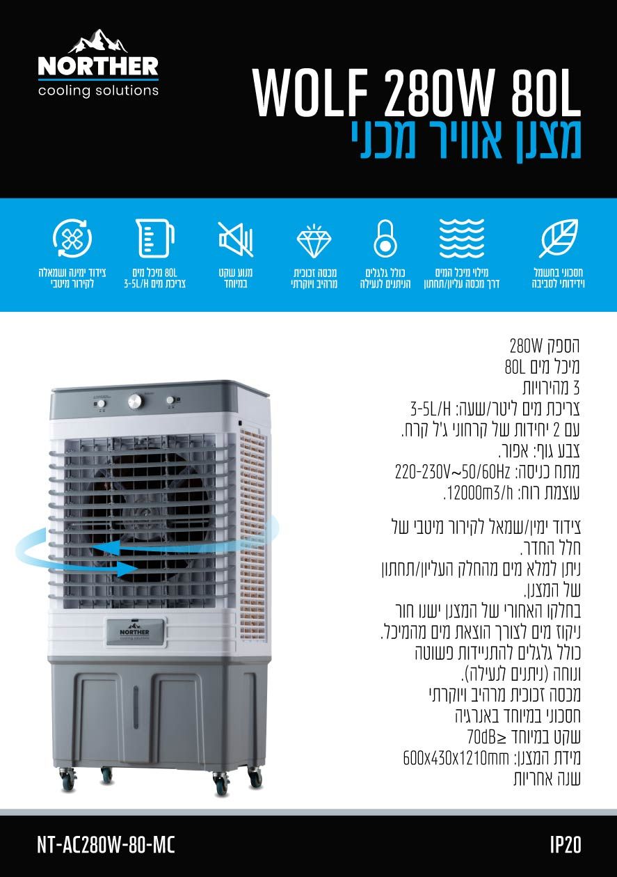 מצנן אוויר מכני WOLF – הספק 280W, מיכל 80 ליטר